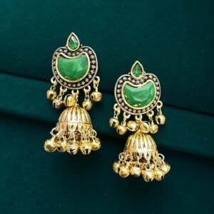 ✨“Add a royal touch to your look with these elegant green-stone jhumka earrings—perfect for festive and ethnic styles.”