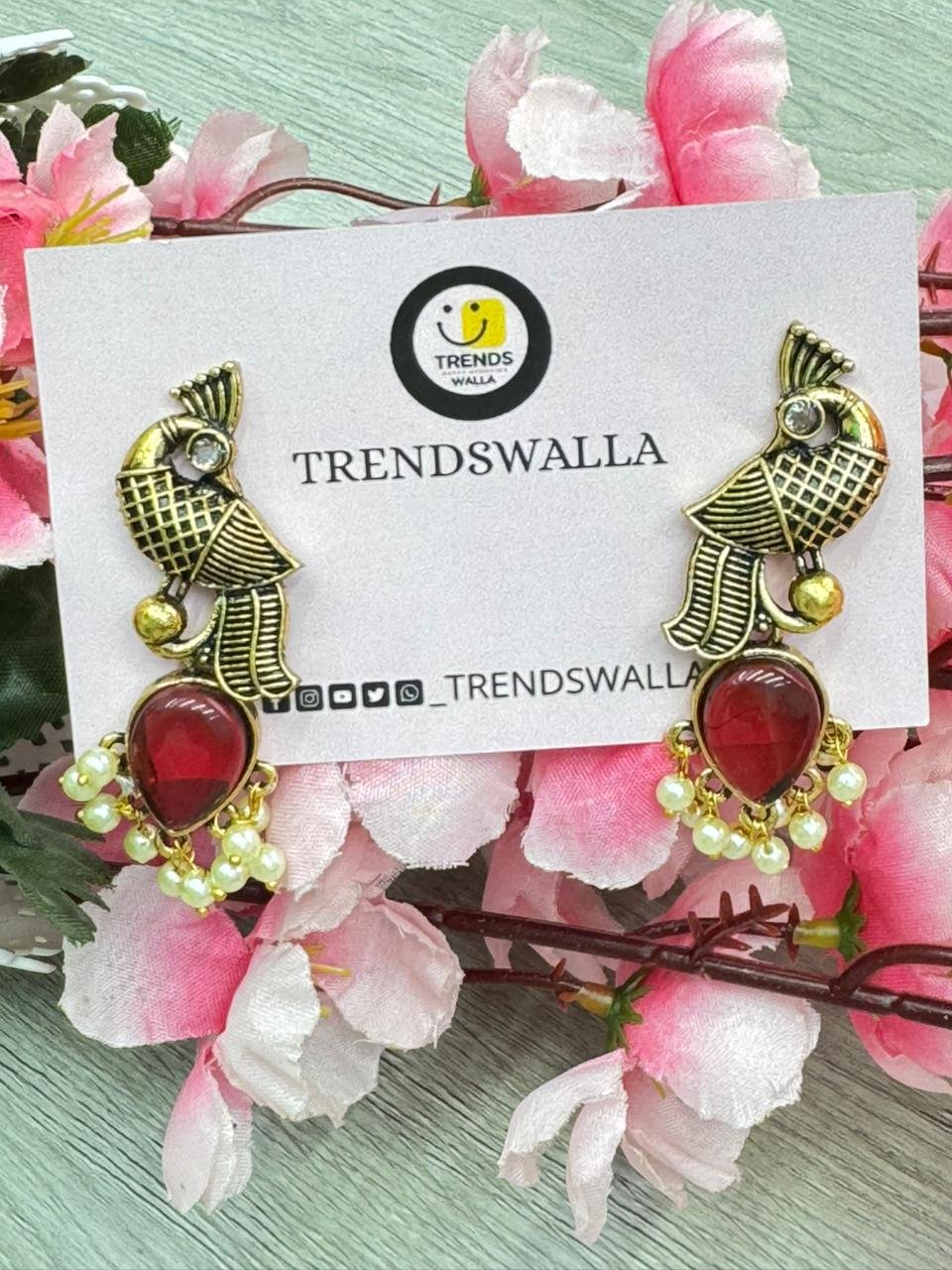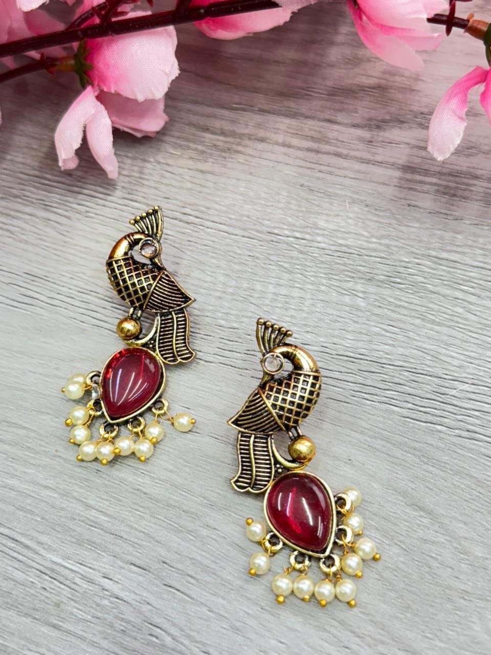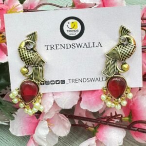 ✨  Elegant antique-gold parrot earrings featuring a ruby-red teardrop stone and delicate pearl danglers. Lightweight and stylish, perfect for festive outfits, ethnic wear, and everyday Indo-fusion looks.
