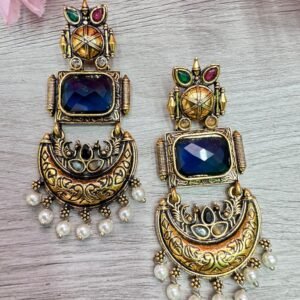 Be the first to review “Antique Gold-Plated Temple Dangler Earrings with Emerald- blue”