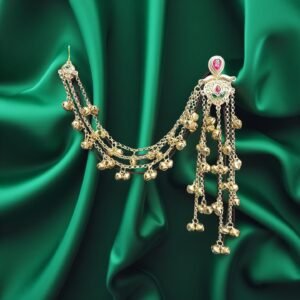 The Apsara Cascade Temple Earrings, a masterpiece crafted for women who adore jewelry that blends tradition with ethereal elegance. These earrings feature a beautifully sculpted top adorned with ruby-pink and emerald-green stones, creating a stunning contrast against the warm gold finish. The highlight is their cascading chain design: multiple delicate strands gracefully fall in layers, each dotted with miniature gold ghungroo beads that shimmer and sway with every movement.